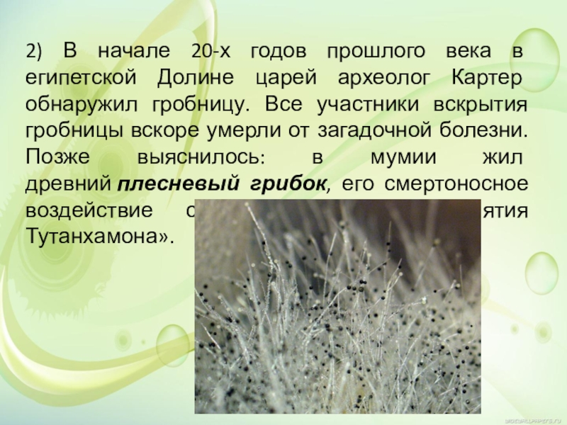 археолог Картер обнаружил гробницу. Все участники вскрытия гробницы вскоре умерли от загадочной болезни. Позже выяснилось: в мумии жил древний плесневый грибок, его смертоносное воздействие стало символом «проклятия Тутанхамона».