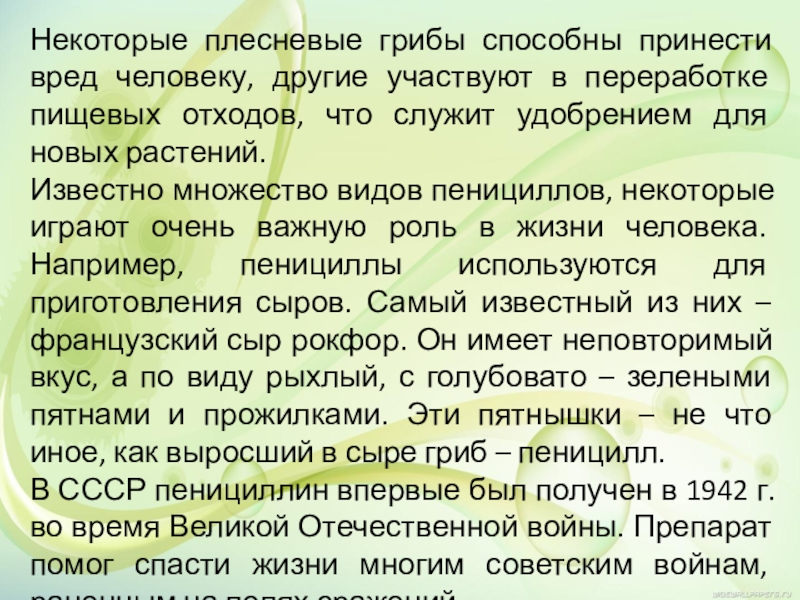 Известно множество видов пенициллов, некоторые играют очень важную роль в жизни человека. Например, пенициллы используются для приготовления сыров. Самый известный из них – французский сыр рокфор. Он имеет неповторимый вкус, а по виду рыхлый, с голубовато – зелеными пятнами и прожилками. Эти пятнышки – не что иное, как выросший в сыре гриб – пеницилл.