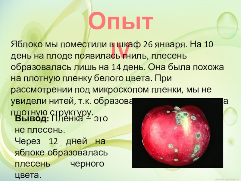 Через 12 дней на яблоке образовалась плесень черного цвета.