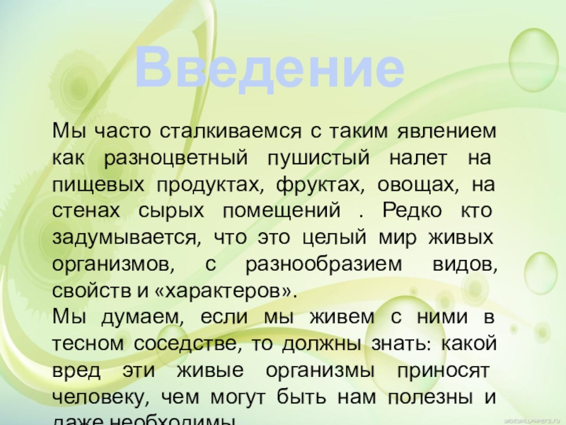 пищевых продуктах, фруктах, овощах, на стенах сырых помещений . Редко кто задумывается, что это целый мир живых организмов, с разнообразием видов, свойств и «характеров».