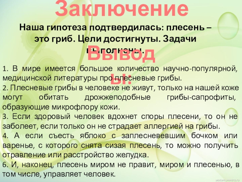 Наша гипотеза подтвердилась: плесень – это гриб. Цели достигнуты. Задачи выполнены.
