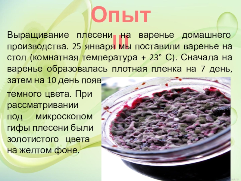 варенье на стол (комнатная температура + 23° С). Сначала на варенье образовалась плотная пленка на 7 день, затем на 10 день появились споры