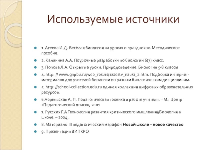 1. Агеева И.Д. Весѐлая биология на уроках и праздниках. Методическое