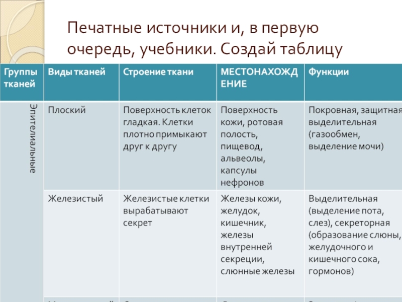Слайд 50Печатные источники и, в первую очередь, учебники. Создай таблицу