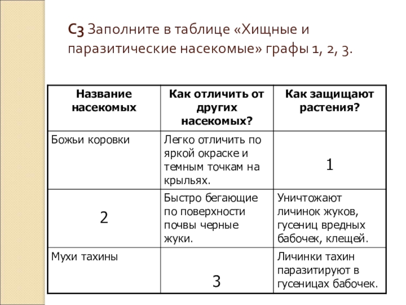 Слайд 22С3 Заполните в таблице «Хищные и паразитические насекомые» графы 1, 2,