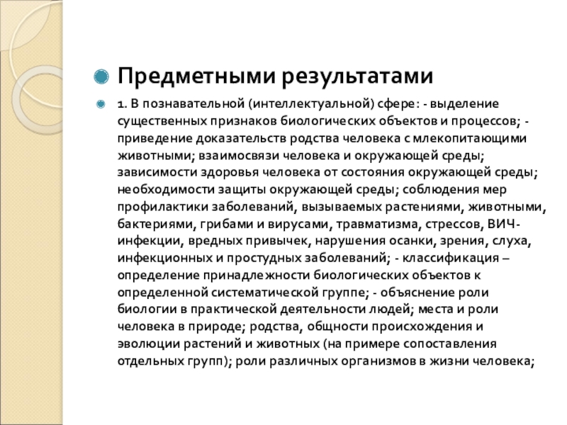 биологических объектов и процессов; - приведение доказательств родства человека с млекопитающими животными; взаимосвязи человека и окружающей среды; зависимости здоровья человека от состояния окружающей среды; необходимости защиты окружающей среды; соблюдения мер профилактики заболеваний, вызываемых растениями, животными, бактериями, грибами и вирусами, травматизма, стрессов, ВИЧ-инфекции, вредных привычек, нарушения осанки, зрения, слуха, инфекционных и простудных заболеваний; - классификация – определение принадлежности биологических объектов к определенной систематической группе; - объяснение роли биологии в практической деятельности людей; места и роли человека в природе; родства, общности происхождения и эволюции растений и животных (на примере сопоставления отдельных групп); роли различных организмов в жизни человека;