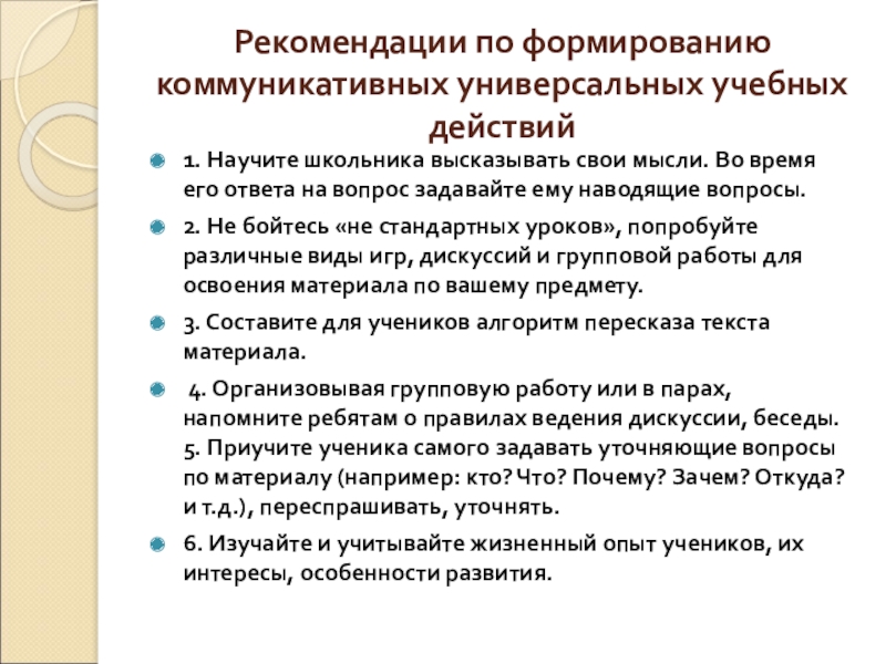 Слайд 55Рекомендации по формированию коммуникативных универсальных учебных действий
