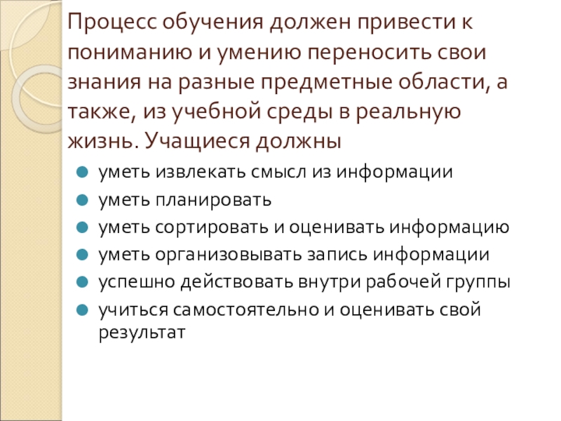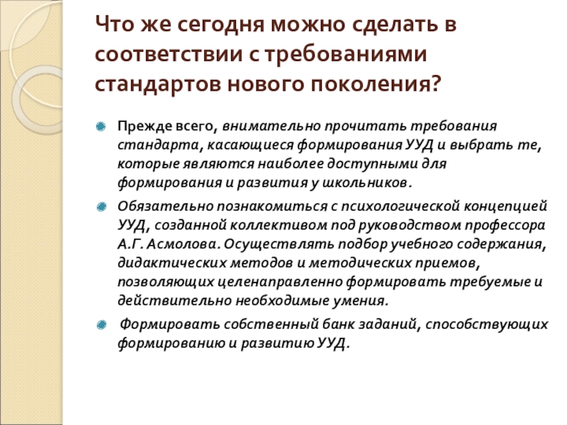 Обязательно познакомиться с психологической концепцией УУД, созданной коллективом под руководством профессора А.Г. Асмолова. Осуществлять подбор учебного содержания, дидактических методов и методических приемов, позволяющих целенаправленно формировать требуемые и действительно необходимые умения.