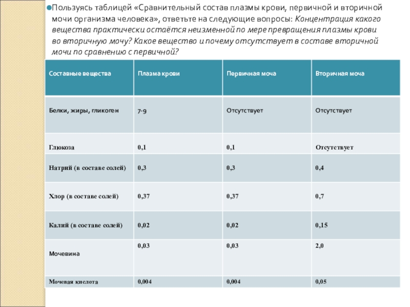 Слайд 23Пользуясь таблицей «Сравнительный состав плазмы крови, первичной и вторичной мочи организма