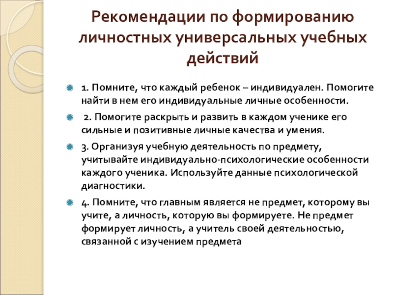 Слайд 53Рекомендации по формированию личностных универсальных учебных действий