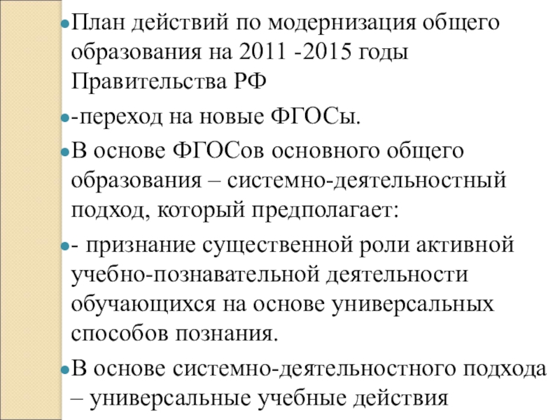 Слайд 3План действий по модернизация общего образования на 2011 -2015 годы Правительства