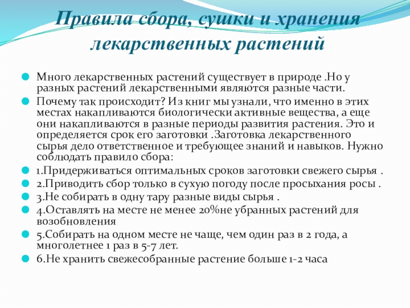 5.Собирать на одном месте не чаще, чем один раз в 2 года, а многолетнее 1 раз в 5-7 лет.