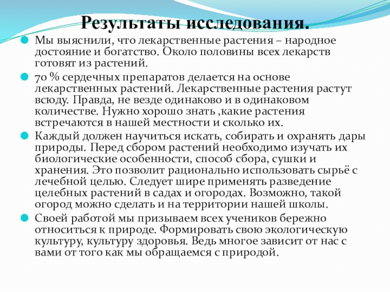 Каждый должен научиться искать, собирать и охранять дары природы. Перед сбором растений необходимо изучать их биологические особенности, способ сбора, сушки и хранения. Это позволит рационально использовать сырьё с лечебной целью. Следует шире применять разведение целебных растений в садах и огородах. Возможно, такой огород можно сделать и на территории нашей школы.