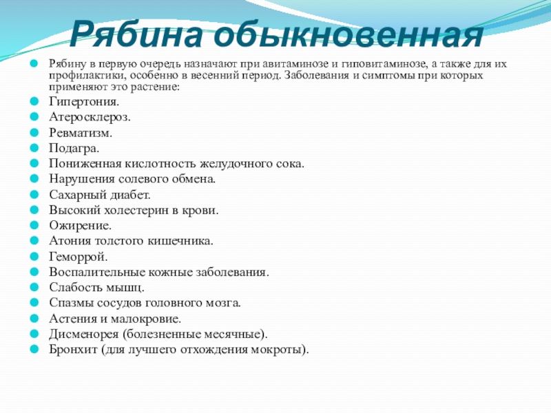 Рябину в первую очередь назначают при авитаминозе и гиповитаминозе, а