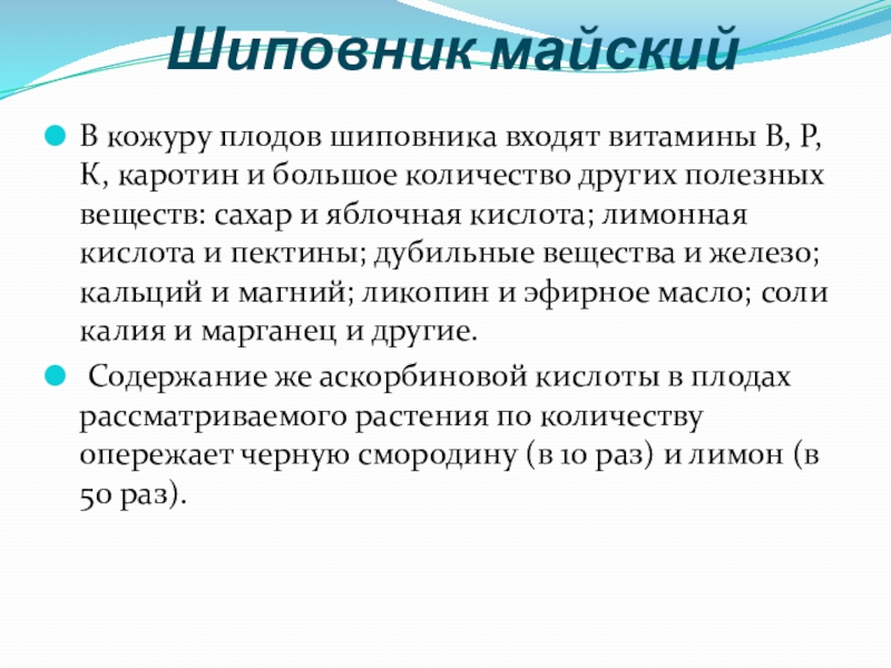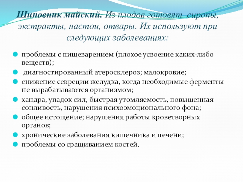 Шиповник майский. Из плодов готовят сиропы, экстракты, настои, отвары. Их используют при следующих заболеваниях: