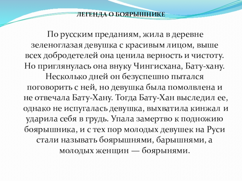 девушка с красивым лицом, выше всех добродетелей она ценила верность и чистоту. Но приглянулась она внуку Чингисхана, Бату-хану. Несколько дней он безуспешно пытался поговорить с ней, но девушка была помолвлена и не отвечала Бату-Хану. Тогда Бату-Хан выследил ее, однако не испугалась девушка, выхватила кинжал и ударила себя в грудь. Упала замертво к подножию боярышника, и с тех пор молодых девушек на Руси стали называть боярышнями, барышнями, а молодых женщин — боярынями.
