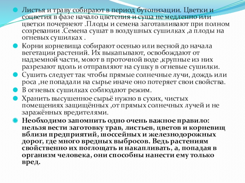 Слайд 22Листья и траву собирают в период бутонизации. Цветки и соцветия в