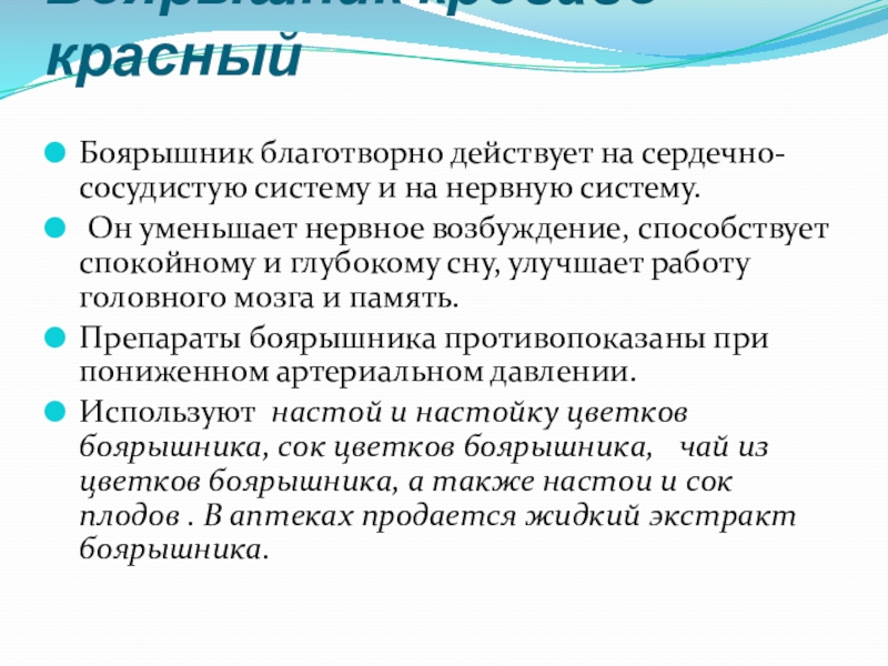 Используют настой и настойку цветков боярышника, сок цветков боярышника, чай из цветков боярышника, а также настои и сок плодов . В аптеках продается жидкий экстракт боярышника.