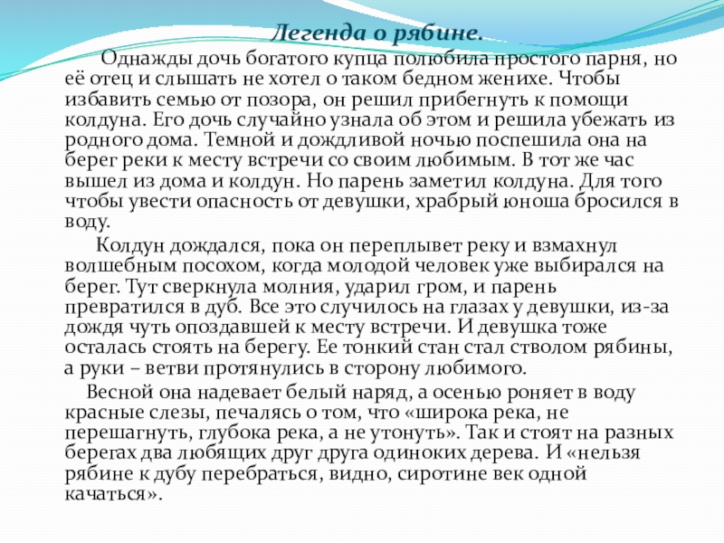 Колдун дождался, пока он переплывет реку и взмахнул волшебным посохом, когда молодой человек уже выбирался на берег. Тут сверкнула молния, ударил гром, и парень превратился в дуб. Все это случилось на глазах у девушки, из-за дождя чуть опоздавшей к месту встречи. И девушка тоже осталась стоять на берегу. Ее тонкий стан стал стволом рябины, а руки – ветви протянулись в сторону любимого.