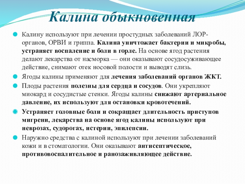 Калину используют при лечении простудных заболеваний ЛОР-органов, ОРВИ и гриппа. Калина