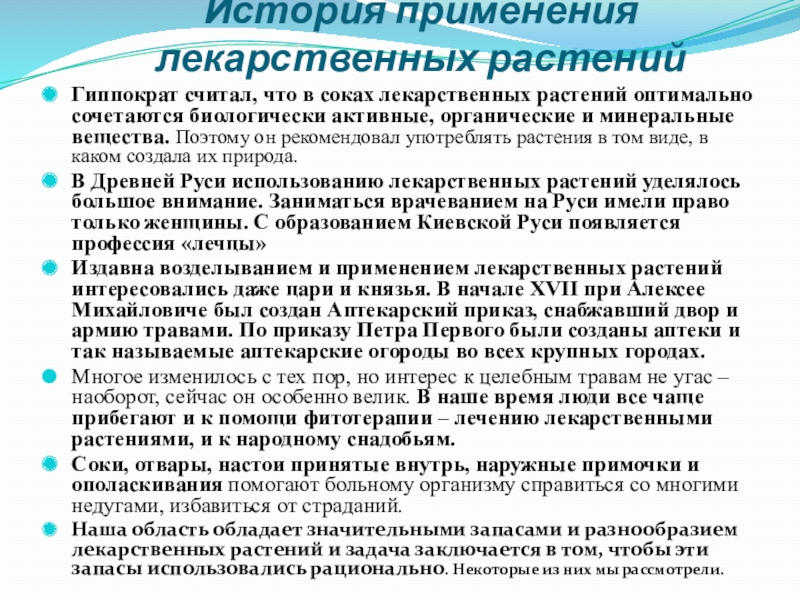 Издавна возделыванием и применением лекарственных растений интересовались даже цари и князья. В начале ХVII при Алексее Михайловиче был создан Аптекарский приказ, снабжавший двор и армию травами. По приказу Петра Первого были созданы аптеки и так называемые аптекарские огороды во всех крупных городах.