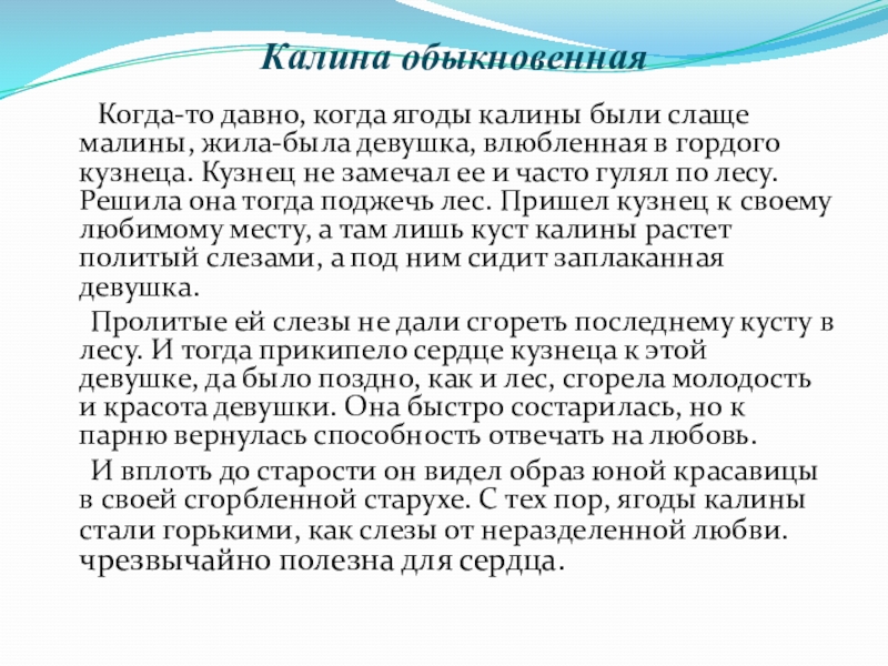 И вплоть до старости он видел образ юной красавицы в своей сгорбленной старухе. С тех пор, ягоды калины стали горькими, как слезы от неразделенной любви. чрезвычайно полезна для сердца.