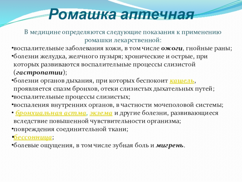 В медицине определяются следующие показания к применению ромашки лекарственной: