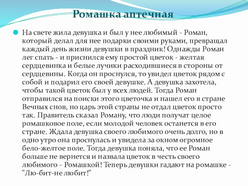 который делал для нее подарки своими руками, превращал каждый день жизни девушки в праздник! Однажды Роман лег спать - и приснился ему простой цветок - желтая сердцевинка и белые лучики расходившиеся в стороны от сердцевины. Когда он проснулся, то увидел цветок рядом с собой и подарил его своей девушке. А девушка захотела, чтобы такой цветок был у всех людей. Тогда Роман отправился на поиски этого цветочка и нашел его в стране Вечных снов, но царь этой страны не отдал цветок просто так. Правитель сказал Роману, что люди получат целое ромашковое поле, если молодой человек останется в его стране. Ждала девушка своего любимого очень долго, но в одно утро она проснулась и увидела за окном огромное бело-желтое поле. Тогда девушка поняла, что ее Роман больше не вернется и назвала цветок в честь своего любимого - Ромашкой! Теперь девушки гадают на ромашке - "Лю-бит-не любит!"