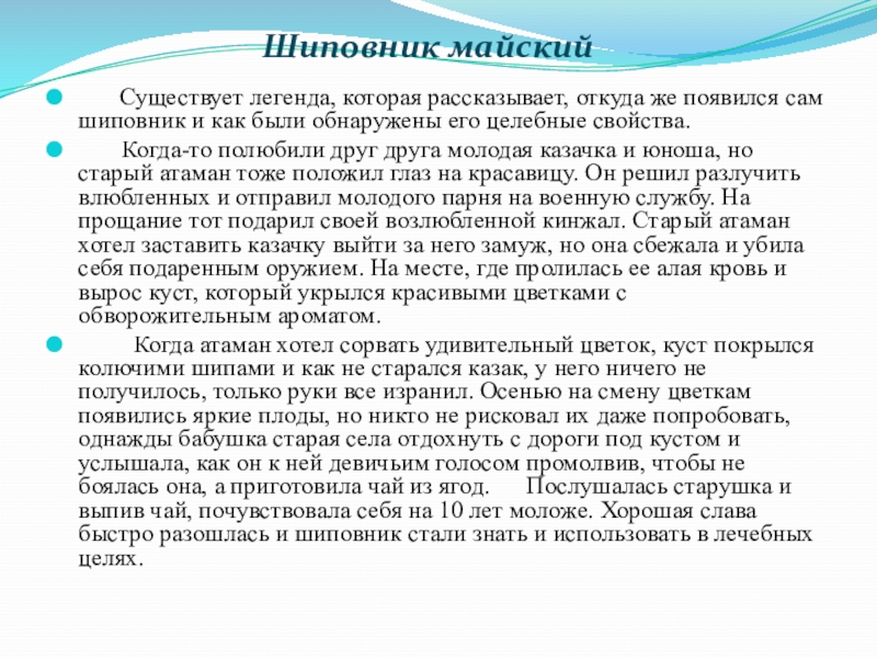 Когда атаман хотел сорвать удивительный цветок, куст покрылся колючими шипами и как не старался казак, у него ничего не получилось, только руки все изранил. Осенью на смену цветкам появились яркие плоды, но никто не рисковал их даже попробовать, однажды бабушка старая села отдохнуть с дороги под кустом и услышала, как он к ней девичьим голосом промолвив, чтобы не боялась она, а приготовила чай из ягод. Послушалась старушка и выпив чай, почувствовала себя на 10 лет моложе. Хорошая слава быстро разошлась и шиповник стали знать и использовать в лечебных целях.