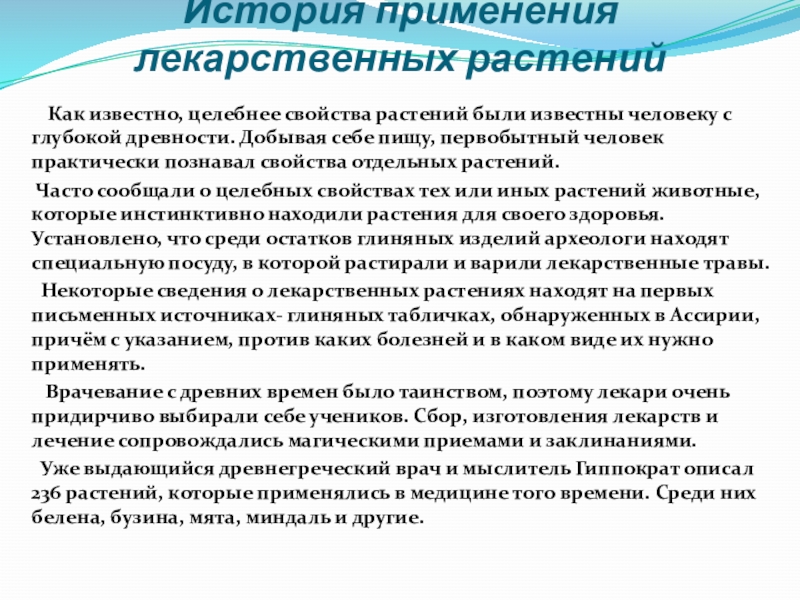 растений были известны человеку с глубокой древности. Добывая себе пищу, первобытный человек практически познавал свойства отдельных растений.