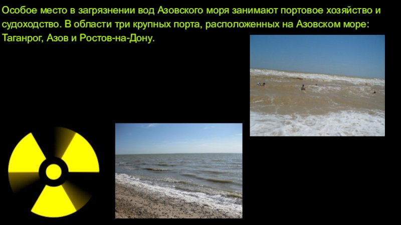 Слайд 5Особое место в загрязнении вод Азовского моря занимают портовое хозяйство и