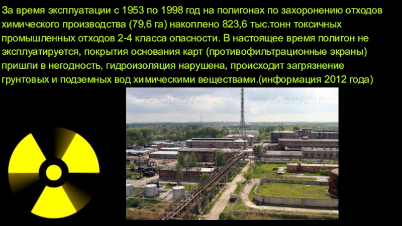 захоронению отходов химического производства (79,6 га) накоплено 823,6 тыс.тонн токсичных промышленных отходов 2-4 класса опасности. В настоящее время полигон не эксплуатируется, покрытия основания карт (противофильтрационные экраны) пришли в негодность, гидроизоляция нарушена, происходит загрязнение грунтовых и подземных вод химическими веществами.(информация 2012 года)
