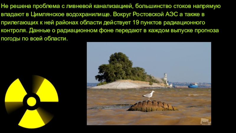 Цимлянское водохранилище. Вокруг Ростовской АЭС а также в прилегающих к ней районах области действует 19 пунктов радиационного контроля. Данные о радиационном фоне передают в каждом выпуске прогноза погоды по всей области.