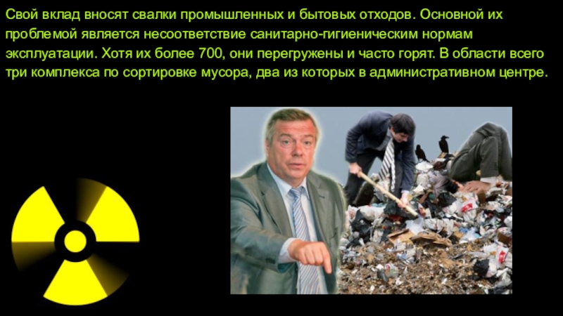 Слайд 4Свой вклад вносят свалки промышленных и бытовых отходов. Основной их проблемой