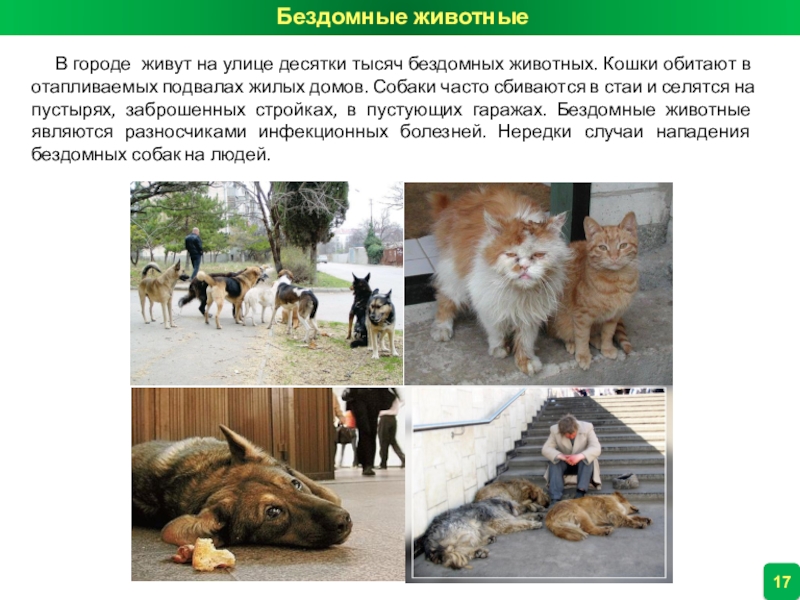 бездомных животных. Кошки обитают в отапливаемых подвалах жилых домов. Собаки часто сбиваются в стаи и селятся на пустырях, заброшенных стройках, в пустующих гаражах. Бездомные животные являются разносчиками инфекционных болезней. Нередки случаи нападения бездомных собак на людей.