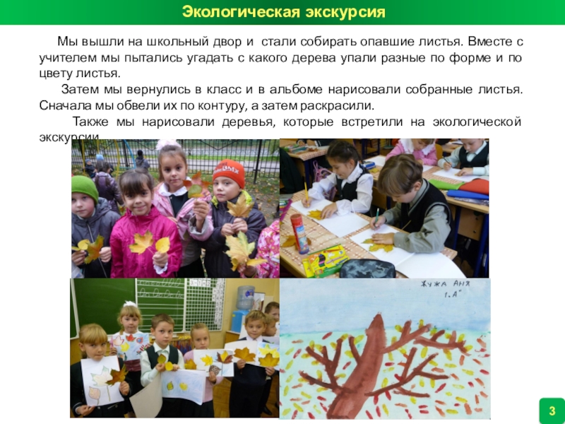 собирать опавшие листья. Вместе с учителем мы пытались угадать с какого дерева упали разные по форме и по цвету листья.