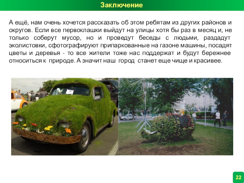 районов и округов. Если все первоклашки выйдут на улицы хотя бы раз в месяц и, не только соберут мусор, но и проведут беседы с людьми, раздадут эколистовки, сфотографируют припаркованные на газоне машины, посадят цветы и деревья - то все жители тоже нас поддержат и будут бережнее относиться к природе. А значит наш город станет еще чище и красивее.