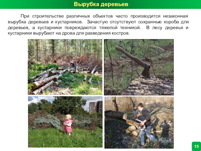 вырубка деревьев и кустарников. Зачастую отсутствуют сохранные короба для деревьев, а кустарники повреждаются тяжелой техникой. В лесу деревья и кустарники вырубают на дрова для разведения костров.