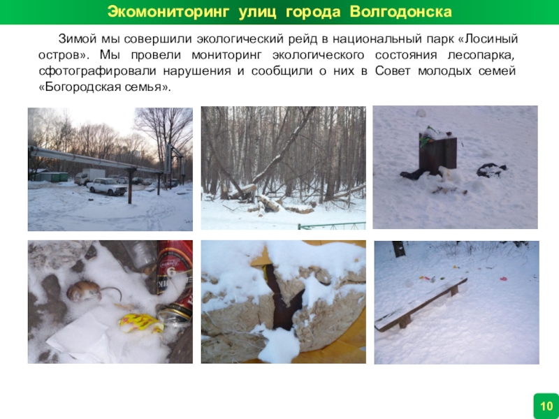 в национальный парк «Лосиный остров». Мы провели мониторинг экологического состояния лесопарка, сфотографировали нарушения и сообщили о них в Совет молодых семей «Богородская семья».
