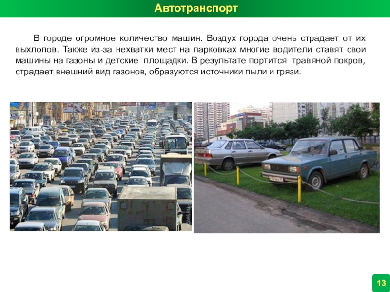 страдает от их выхлопов. Также из-за нехватки мест на парковках многие водители ставят свои машины на газоны и детские площадки. В результате портится травяной покров, страдает внешний вид газонов, образуются источники пыли и грязи.