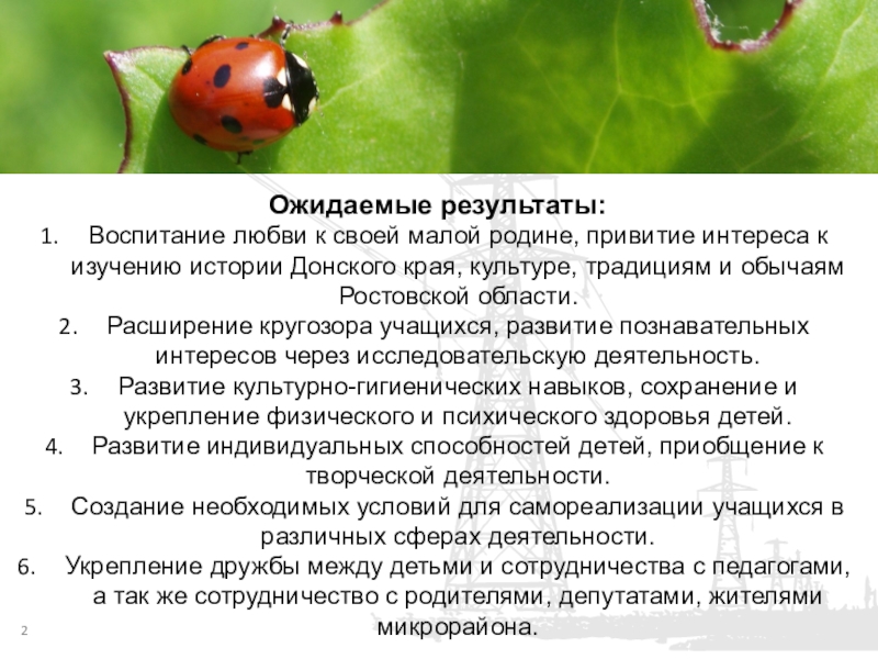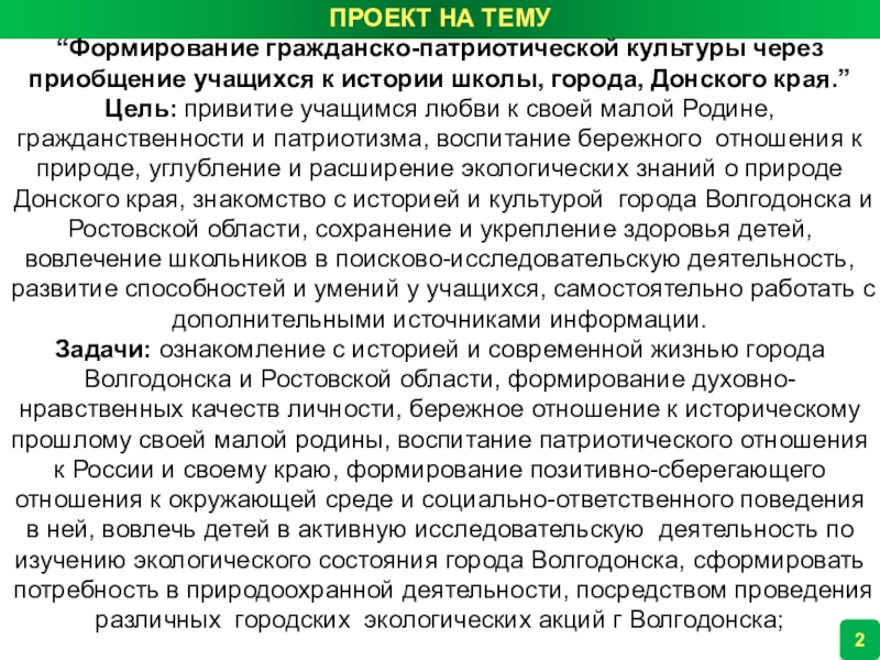 Задачи: ознакомление с историей и современной жизнью города Волгодонска и Ростовской области, формирование духовно-нравственных качеств личности, бережное отношение к историческому прошлому своей малой родины, воспитание патриотического отношения к России и своему краю, формирование позитивно-сберегающего отношения к окружающей среде и социально-ответственного поведения в ней, вовлечь детей в активную исследовательскую деятельность по изучению экологического состояния города Волгодонска, сформировать потребность в природоохранной деятельности, посредством проведения различных городских экологических акций г Волгодонска;