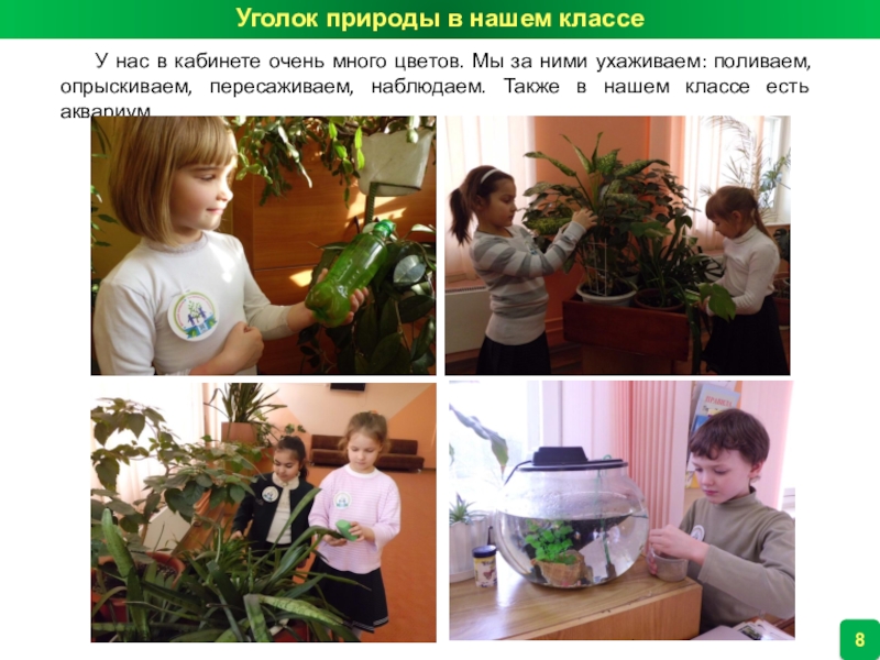 очень много цветов. Мы за ними ухаживаем: поливаем, опрыскиваем, пересаживаем, наблюдаем. Также в нашем классе есть аквариум.