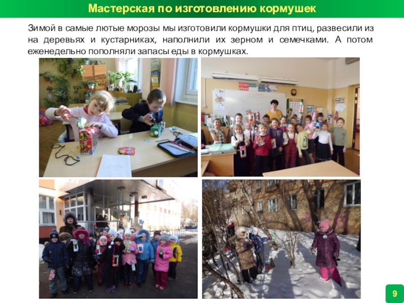 для птиц, развесили из на деревьях и кустарниках, наполнили их зерном и семечками. А потом еженедельно пополняли запасы еды в кормушках.