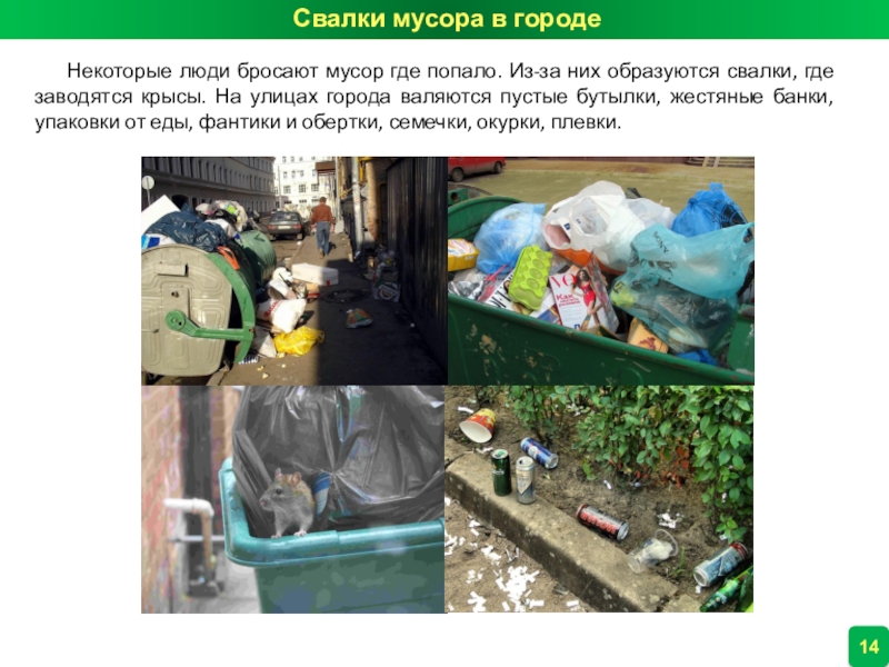 попало. Из-за них образуются свалки, где заводятся крысы. На улицах города валяются пустые бутылки, жестяные банки, упаковки от еды, фантики и обертки, семечки, окурки, плевки.