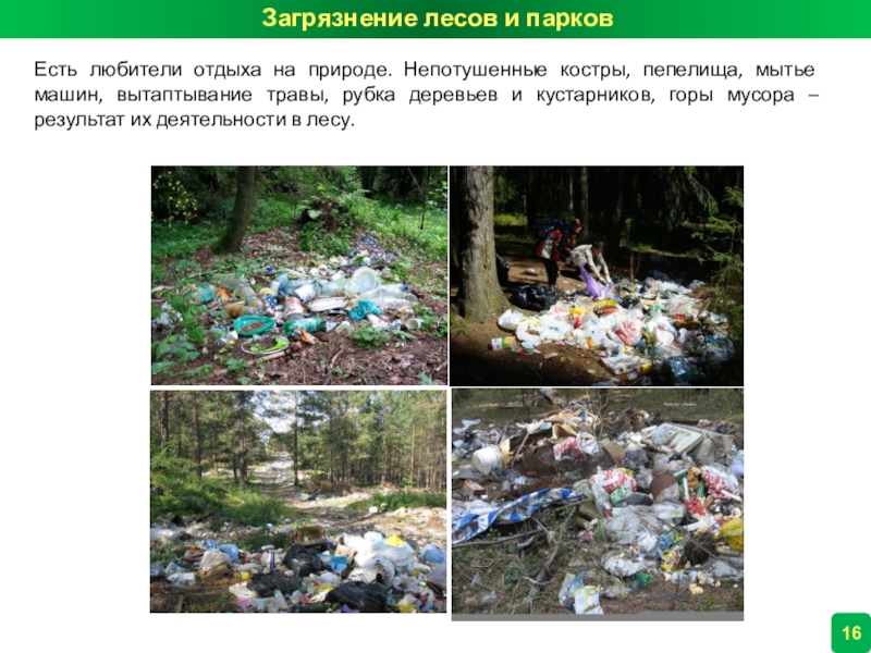 мытье машин, вытаптывание травы, рубка деревьев и кустарников, горы мусора – результат их деятельности в лесу.