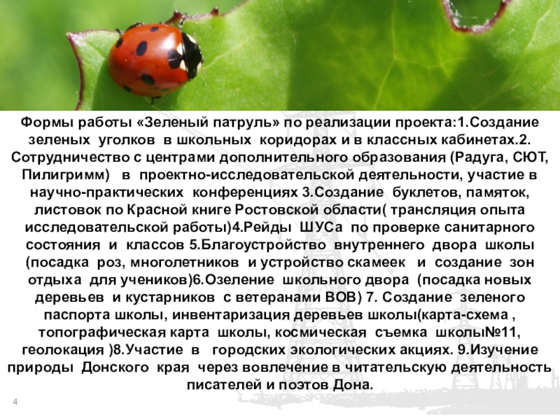 коридорах и в классных кабинетах.2.Сотрудничество с центрами дополнительного образования (Радуга, СЮТ, Пилигримм) в проектно-исследовательской деятельности, участие в научно-практических конференциях 3.Создание буклетов, памяток, листовок по Красной книге Ростовской области( трансляция опыта исследовательской работы)4.Рейды ШУСа по проверке санитарного состояния и классов 5.Благоустройство внутреннего двора школы (посадка роз, многолетников и устройство скамеек и создание зон отдыха для учеников)6.Озеление школьного двора (посадка новых деревьев и кустарников с ветеранами ВОВ) 7. Создание зеленого паспорта школы, инвентаризация деревьев школы(карта-схема ,топографическая карта школы, космическая съемка школы№11,геолокация )8.Участие в городских экологических акциях. 9.Изучение природы Донского края через вовлечение в читательскую деятельность писателей и поэтов Дона.
