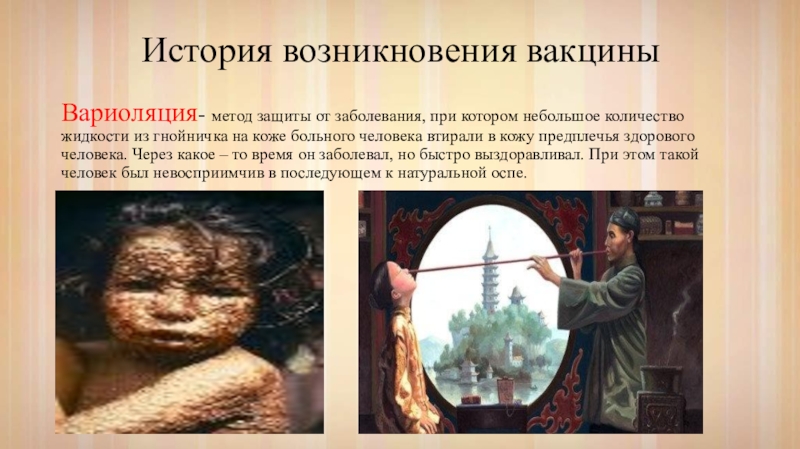 История возникновения вакциныВариоляция- метод защиты от заболевания, при котором небольшое количество жидкости из гнойничка на коже больного