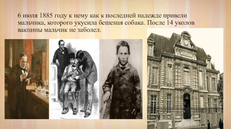 6 июля 1885 году к нему как к последней надежде привели мальчика, которого укусила бешеная собака. После