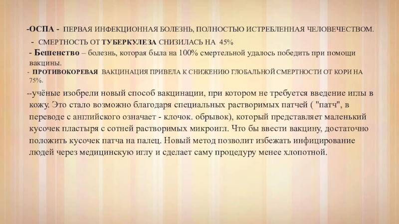 ОСПА - ПЕРВАЯ ИНФЕКЦИОННАЯ БОЛЕЗНЬ, ПОЛНОСТЬЮ ИСТРЕБЛЕННАЯ ЧЕЛОВЕЧЕСТВОМ. - СМЕРТНОСТЬ ОТ ТУБЕРКУЛЕЗА СНИЗИЛАСЬ НА 45%- Бешенство –