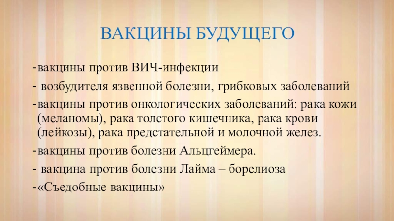 ВАКЦИНЫ БУДУЩЕГОвакцины против ВИЧ-инфекции возбудителя язвенной болезни, грибковых заболеванийвакцины против онкологических заболеваний: рака кожи (меланомы), рака толстого